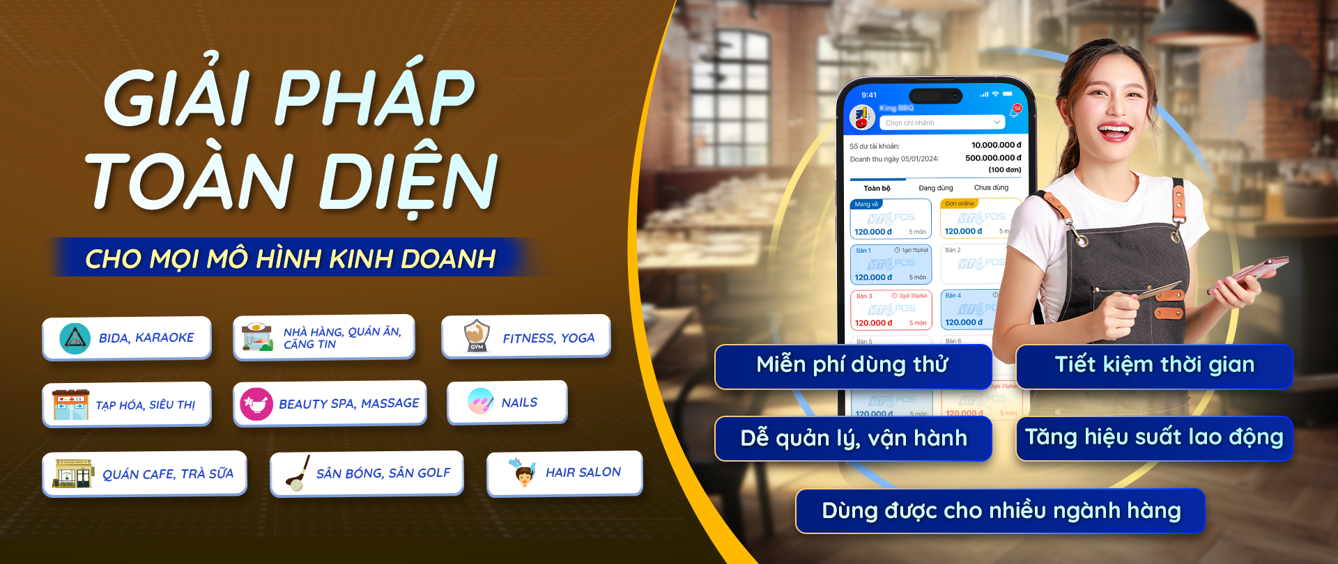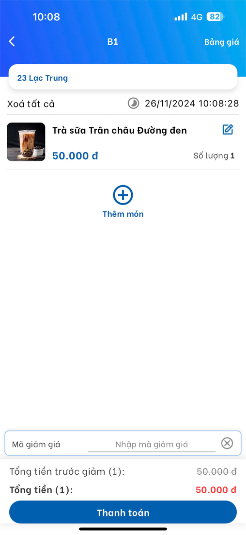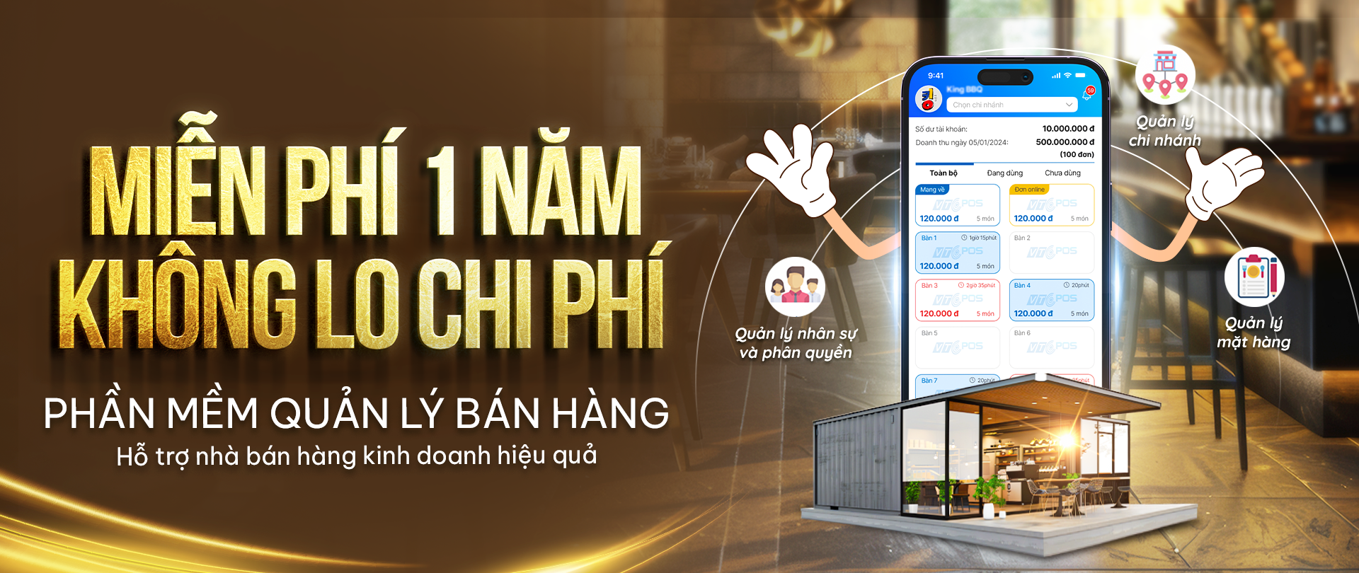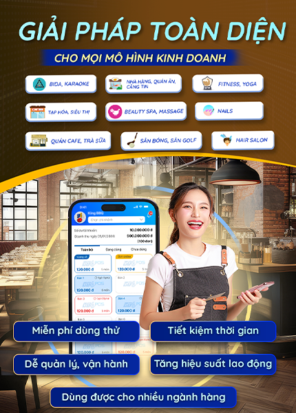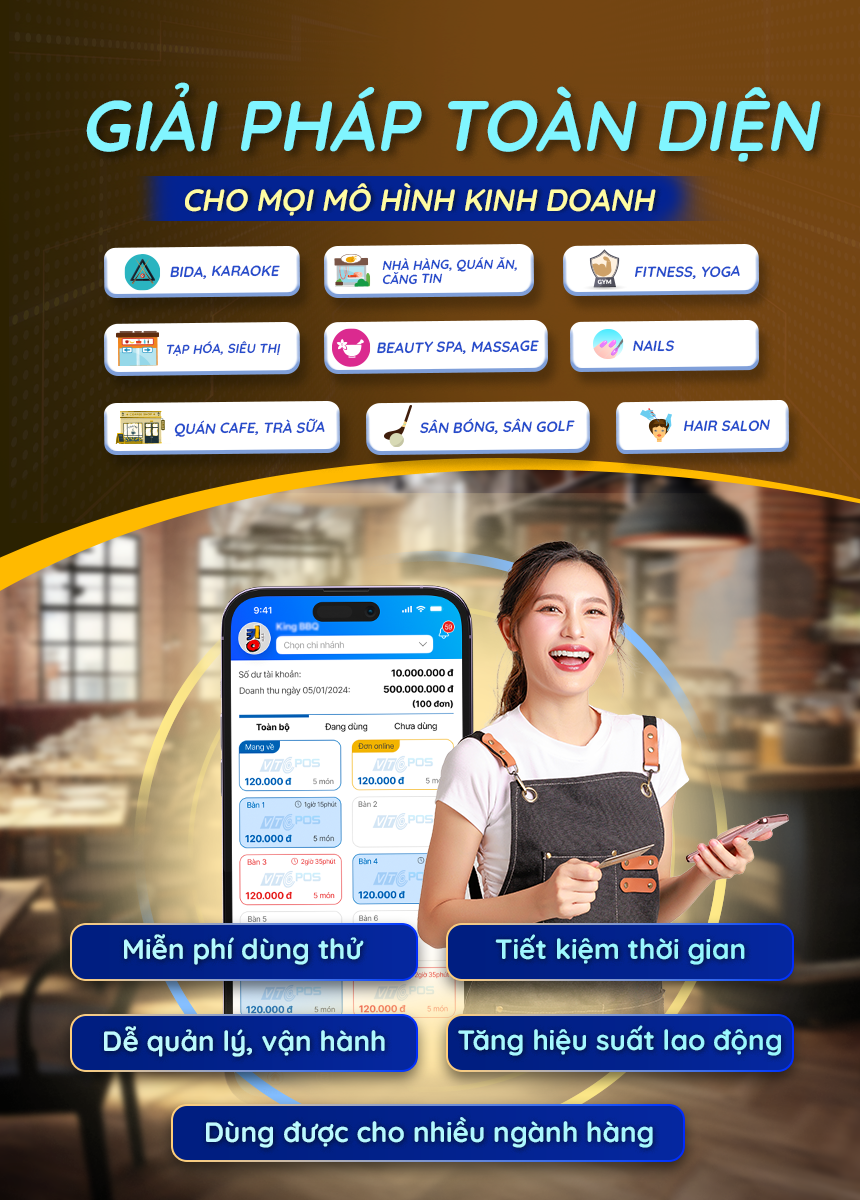 Tất cả tính năng trong 1 ứng dụng (thanh toán đơn hàng, cài đặt thực đơn, quản lý nhân viên, quản lý đơn hàng, xem báo cáo doanh thu... v.v)